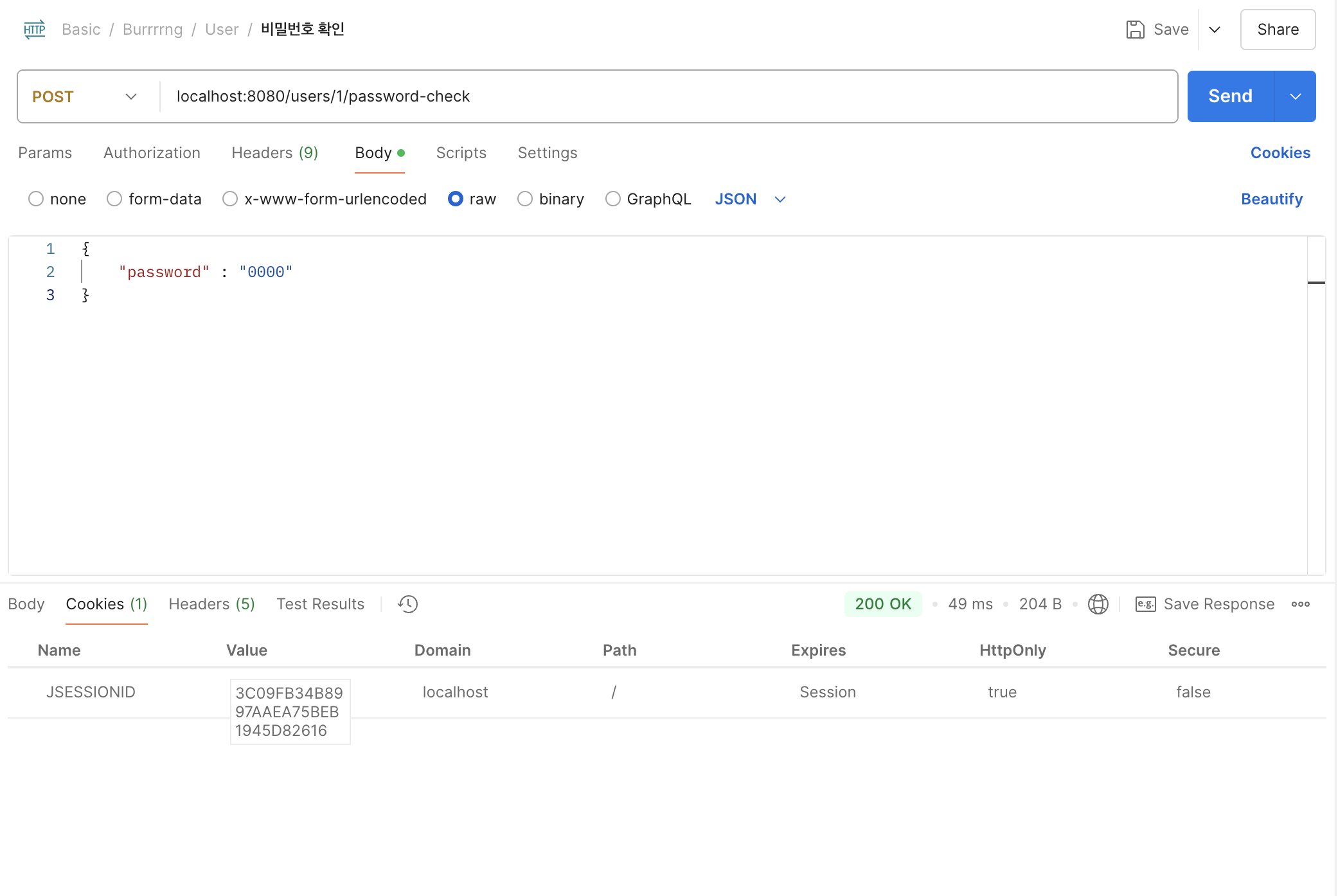 쿠키에 비밀번호 일치 여부 값이 들어있는 sessionId가 들어있는 것을 확인할 수 있다.