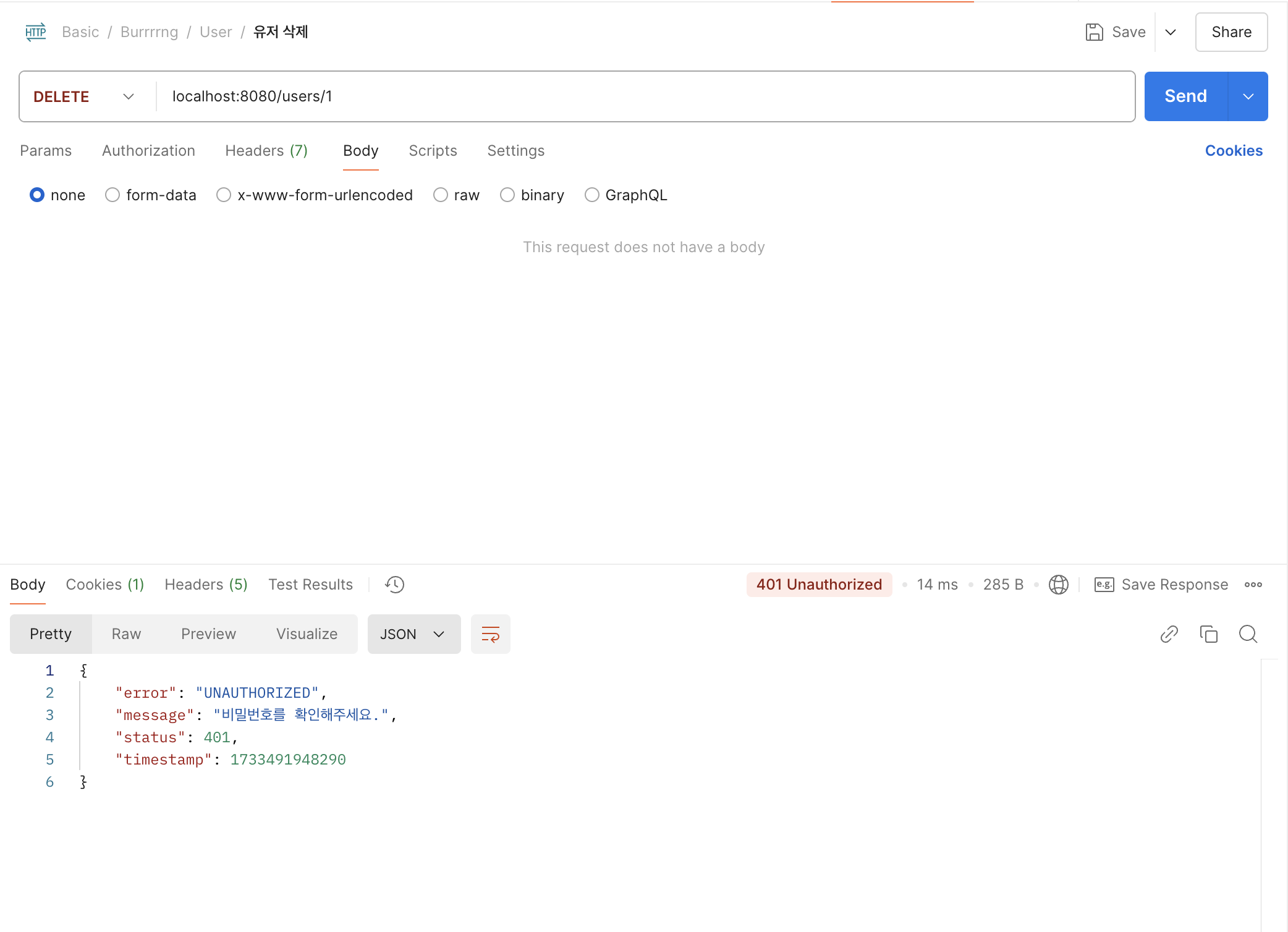 throw new ResponseStatusException(HttpStatus.UNAUTHORIZED, "본인만 삭제 가능합니다.");