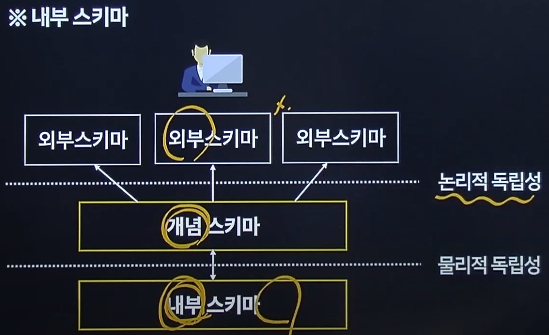 - 외부 스키마 : 뷰와 관련, 사용자나 응용 프로그래머가 접근할 수 있는 정의를 기술